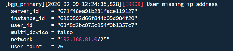 I have a VPN server with a /25 virtual network and 26 users set up for that organization. All users are assigned a static IP address, while new client profiles are assigned a dynamic IP address, which changes each time the user connects. What is the fix to this problem, given that a /25 subnet has 128 IP addresses and the pool is not exhausted? I restarted the server and checked multiple devices, but it was not enabled.