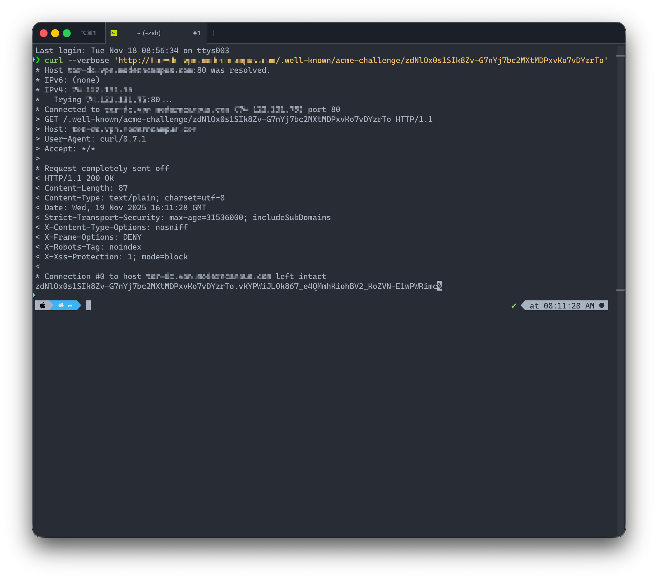ValueError: Challenge did not pass for vpn.server.hostname.tld: {'identifier': {'type': 'dns', 'value': 'vpn.server.hostname.tld'}, 'status': 'invalid', 'expires': '2025-11-25T22:21:21Z', 'challenges': [{'type': 'http-01', 'url': 'https://acme-v02.api.letsencrypt.org/acme/chall/2810300146/614933220256/CHk61A', 'status': 'invalid', 'validated': '2025-11-18T22:21:22Z', 'error': {'type': 'urn:ietf:params:acme:error:unauthorized', 'detail': 'During secondary validation: xxx.xxx.xxx.xxx: Invalid response from http://vpn.server.hostname.tld/.well-known/acme-challenge/YUUYdx_VaV5Rmw-c2X4oZ84TJ4RkoBUfoRruEn_8oZo: 403', 'status': 403}, 'token': 'YUUYdx_VaV5Rmw-c2X4oZ84TJ4RkoBUfoRruEn_8oZo', 'validationRecord': [{'url': 'http://vpn.server.hostname.tld/.well-known/acme-challenge/YUUYdx_VaV5Rmw-c2X4oZ84TJ4RkoBUfoRruEn_8oZo', 'hostname': 'vpn.server.hostname.tld', 'port': '80', 'addressesResolved': ['xxx.xxx.xxx.xxx'], 'addressUsed': 'xxx.xxx.xxx.xxx'}]}]}