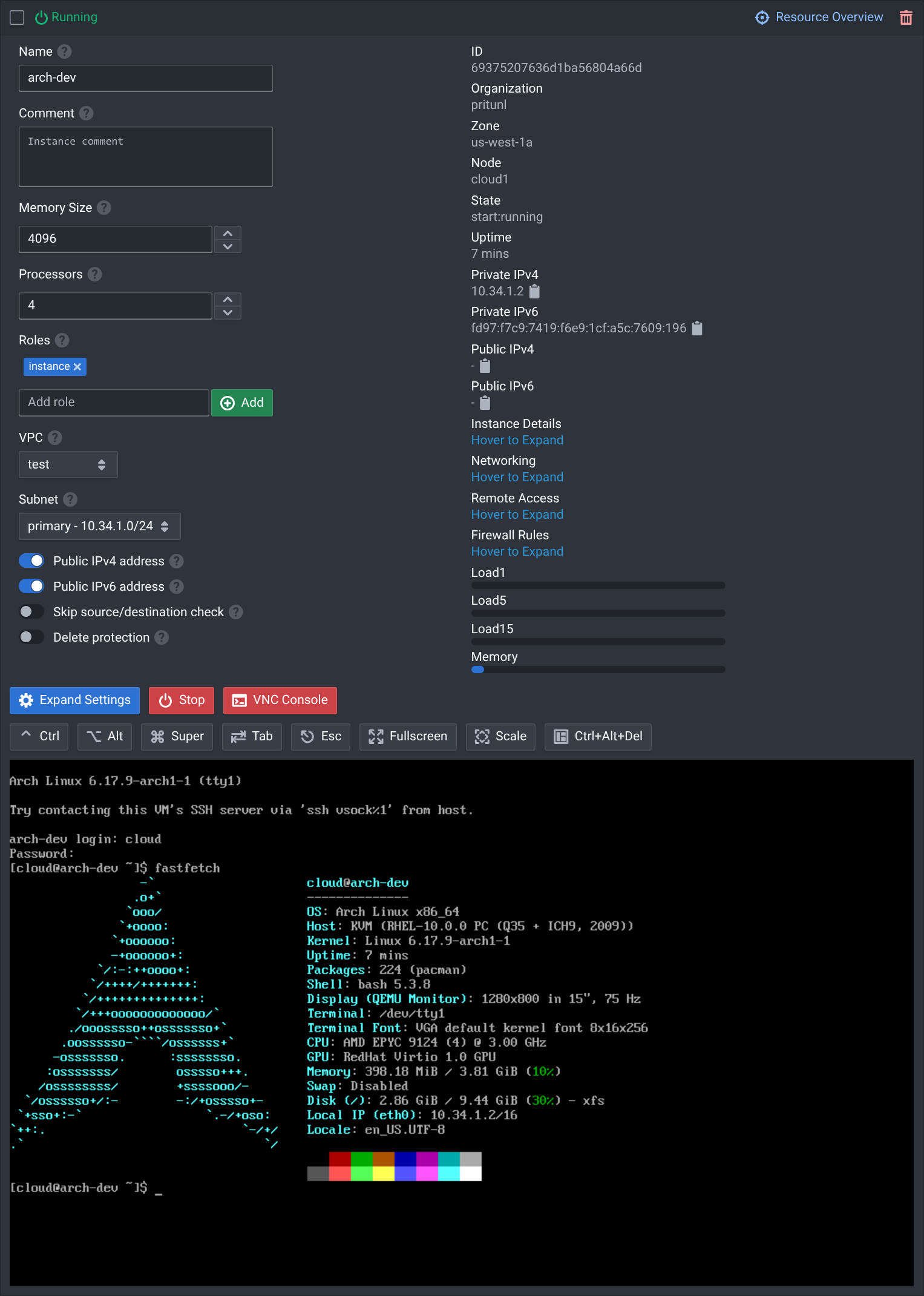 Arch Linux instances images are now available in the official Pritunl Cloud base images. As with all the other base images there is full support for the Pritunl Cloud pods system, IMDS service and private DNS.