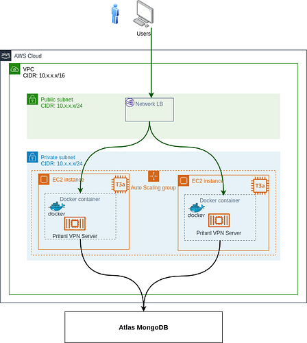 I use AWS, LB → 2 EC2 instances (Pritunl server in Docker container on these instances). And this EC2 instances in 2 availability zones (us-east-1a, us-east-1b)